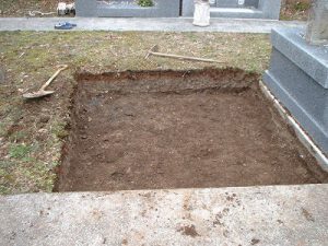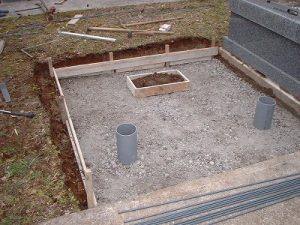 基礎コンクリートの上に据付ける石材底部は、モルタルの絡みが良くなるように加工を施しています。