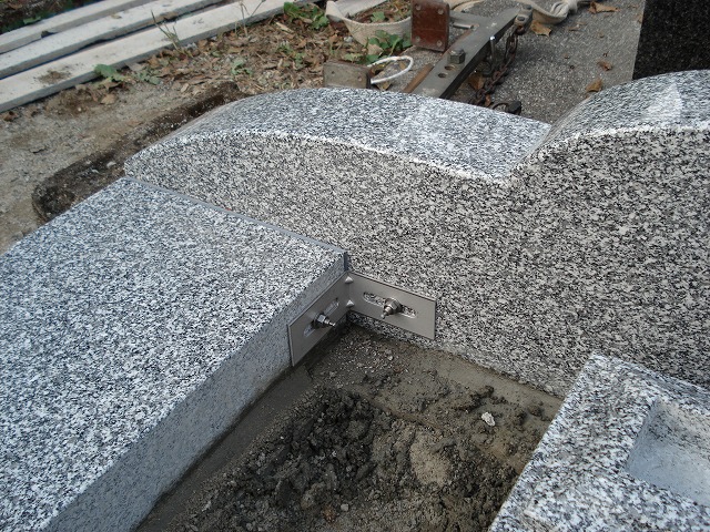 またL型金具で全てのつなぎ目を補強してあります。墓地後方の石材結合部も、L型金具で補強してあります。