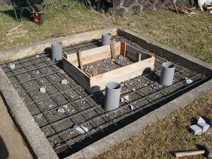 異形鉄筋を並べて排水パイプをセットします。
