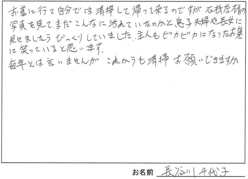 主人もピカピカになったお墓に笑っていると思います。 お墓に行って自分では清掃して帰って来るのですが、石材店様の写真を見て、まだこんなに汚れていたのかと息子夫婦や長女に見せましたらびっくりしていました。主人もピカピカになったお墓に笑っていると思います。毎年とは言いませんが、これからも清掃お願いできなすか? 伊豆市在住|長谷川 千代子 様