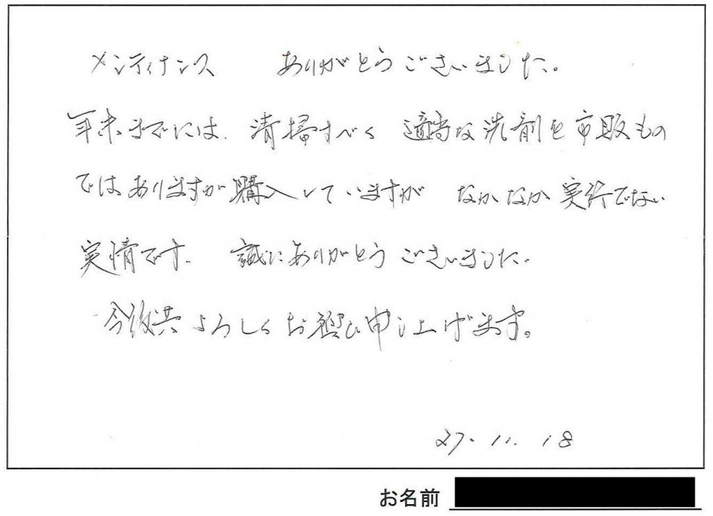 誠にありがとうございました。 メンテナンスありがとうございました。年末までには清掃すべく、適当な洗剤を市販ものではありますが購入していますが、なかなか実行できない実情です。誠にありがとうございました。今後共よろしくお願い申し上げます。三島市在住 H.T様(男性)