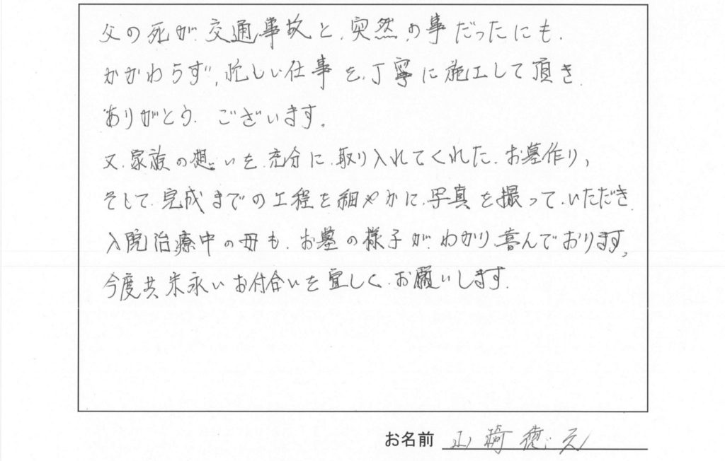 完成までの工程を細やかに写真を撮っていただき、入院治療中の母もお墓の様子がわかり喜んでおります。 父の死が交通事故と、突然の事だったにもかかわらず、忙しい仕事を丁寧に施工して頂きありがとうございます。また、家族の想いを充分に取り入れてくれたお墓作り、そして完成までの工程を細やかに写真を撮っていただき、入院治療中の母もお墓の様子がわかり喜んでおります。今後共、末永いお付き合いを宜しくお願いします。 伊豆の国市|山崎 徳之 様