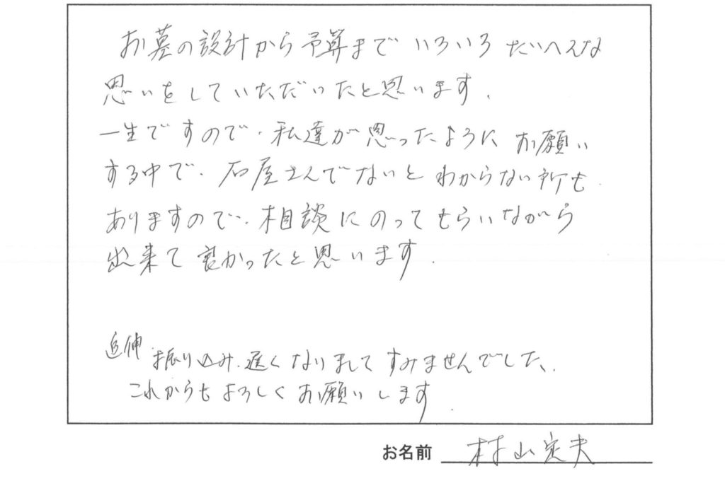 こちらからの無理なデザインにも適切なアドバイスのもと、すばらしい墓ができ、石碑に入れる、拙い筆ながら何枚かの私筆文字も老父が選んだものを採用できたので大変嬉しい限りです。 学生の頃から信頼も厚く、リーダー的な存在だったので、とても頼もしかったです。予算のない中、こちらからの無理なデザインにも適切なアドバイスのもと、すばらしい墓ができ、石碑に入れる、拙い筆ながら何枚かの私筆文字も老父が選んだものを採用できたので大変嬉しい限りです。今回私が遠く(県外)で生活しているため、完成まで電話連絡によるプロセスでしたが、そつなくこなしてくれてとても感謝しています。ネットを見なければ始まらなかった事を思うと、これも運命の不思議を感じます。ありがとうございました。 東京都|鴨下 厚広 様