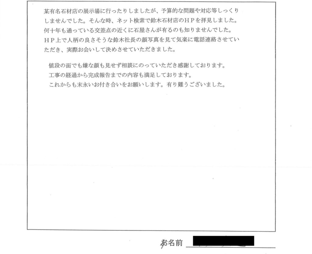 HP上で人柄の良さそうな社長さん顔写真を見て気楽に電話連絡をさせていただき、実際にお会いして決めさせていただきました。 某有名石材店の展示場に行ったりしましたが、予算的な問題や対応等しっくりしませんでした。そんな時、ネット検索で、筋規制材店のHPを拝見しました。何十年も通っている交差点の近くに石屋さんがあるのも知りませんでした。HP上で人柄の良さそうな社長さん顔写真を見て気楽に電話連絡をさせていただき、実際にお会いして決めさせていただきました。値段の面でも嫌な顔も見せず相談にのっていただき感謝しております。工事の経過から完成報告までの内容も満足しております。これからも末長いお付合いをお願いします。有り難うございました。 伊豆市|K.K 様 (男性)