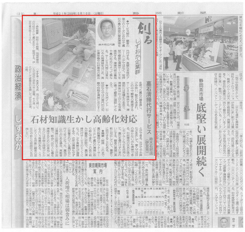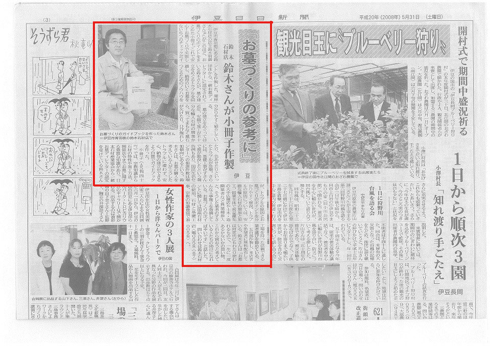 お客様の参考になればとの思いから作成した小冊子や私どもの日頃の地道な活動が評価され、「静岡新聞」「伊豆新聞」「熱海新聞」「伊豆日日新聞」などの取材を受け掲載されました。また、ベストセラー作家である山岸二郎氏の著書『ペンだけでブランディングするすごい裏技(なぜルパン三世は泥棒なのにヒーローなのか)』の中では「地域の人たちに信頼されている正直者の墓石屋さんの事例」として24ページに渡り紹介されています。