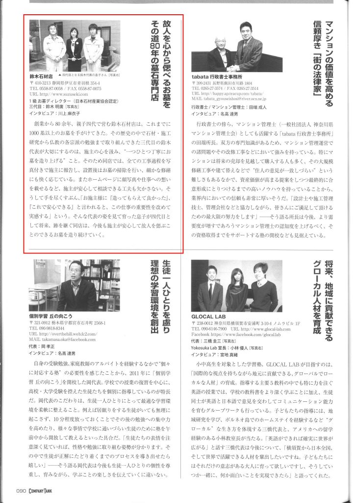 お客様の参考になればとの思いから作成した小冊子や私どもの日頃の地道な活動が評価され、「静岡新聞」「伊豆新聞」「熱海新聞」「伊豆日日新聞」などの取材を受け掲載されました。また、ベストセラー作家である山岸二郎氏の著書『ペンだけでブランディングするすごい裏技(なぜルパン三世は泥棒なのにヒーローなのか)』の中では「地域の人たちに信頼されている正直者の墓石屋さんの事例」として24ページに渡り紹介されています。
