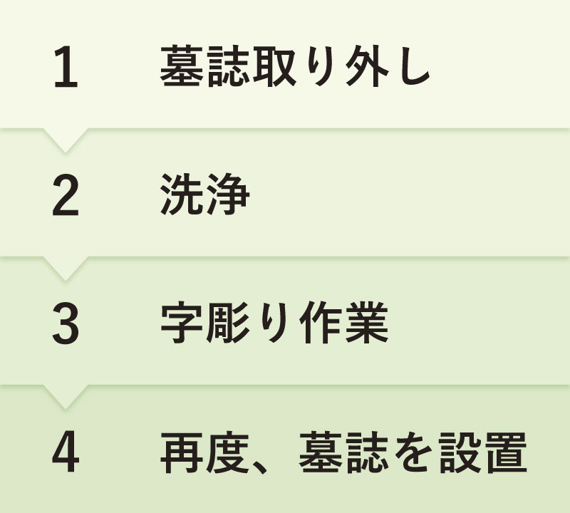 字堀りとは、墓石に戒名の彫刻をすることです。お墓を建てる際はもちろん、亡くなった方が新たに増えた場合に「墓誌」や、墓石の裏側に刻むものです。