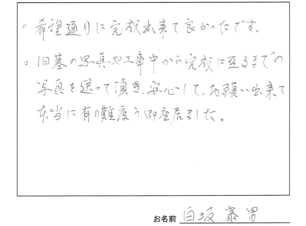希望通り完成できて良かったです。旧墓の写真や工事中から完成に至るまでの写真を送っていただき安心してお願い出来て本当に有り難う御座居ました。