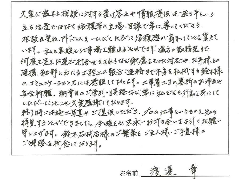 私も家族も仕事場を離れることができず遠方の勤務先まで何度も足とお運び打ち合わせをされるなど配慮をもった対応やお寺様との連携、細部にわたる工程上の報告・連絡まで不安を払拭する鈴木様のコミュニケーション力には感服しております。