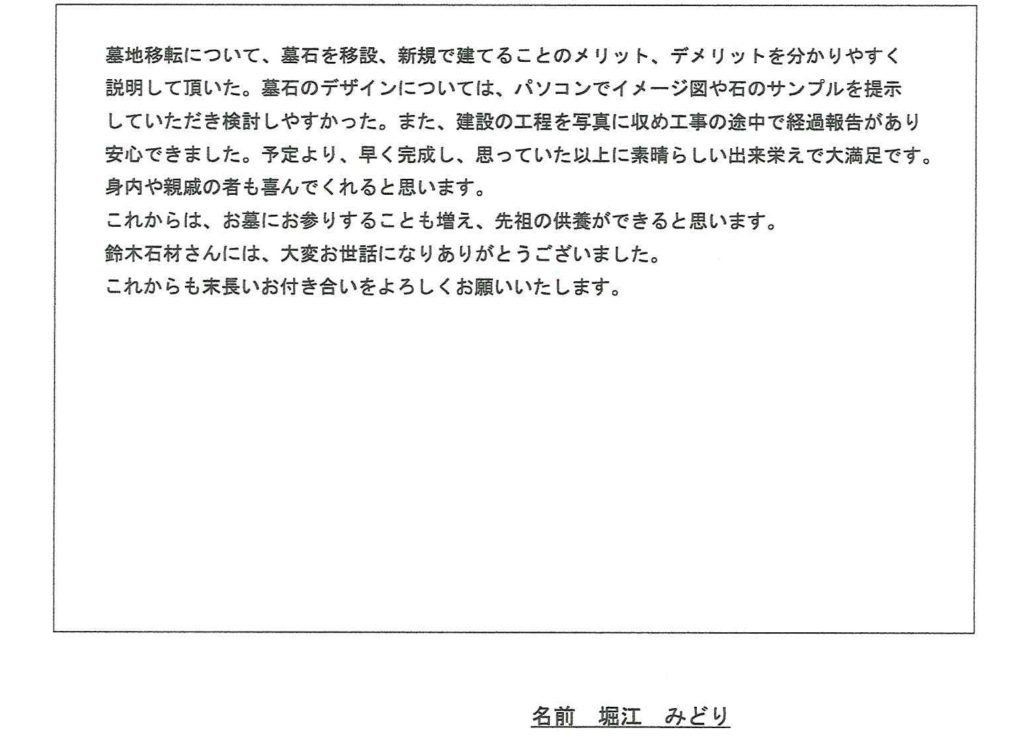 鈴木さんは初めから主人のお墓を主に考えてくれました。予算内で工事して頂き、大変感謝しています。本家も感激しております。本当にありがとうございました。