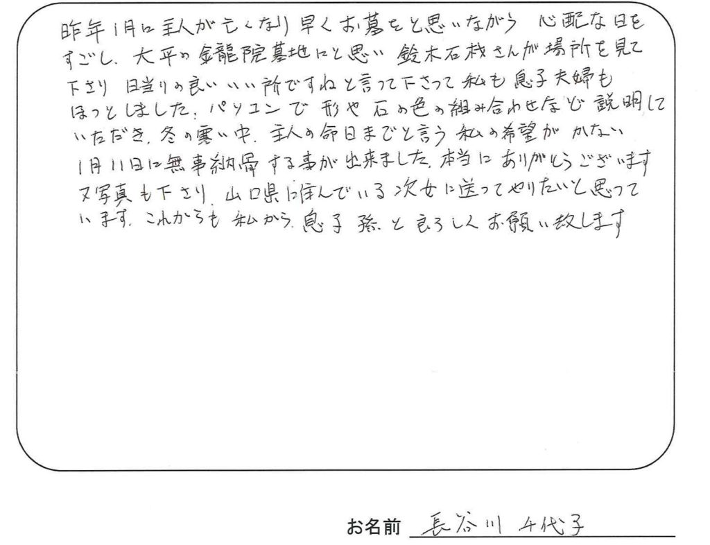 昨年1月に主人が亡くなり早くお墓をと思いながら心配の日を過ごし、大平の金龍院墓地にと思い鈴木石材さんが場所を見て下さり、日当たりの良いいい所ですねと言って下さって私も息子夫婦もほっとしました。